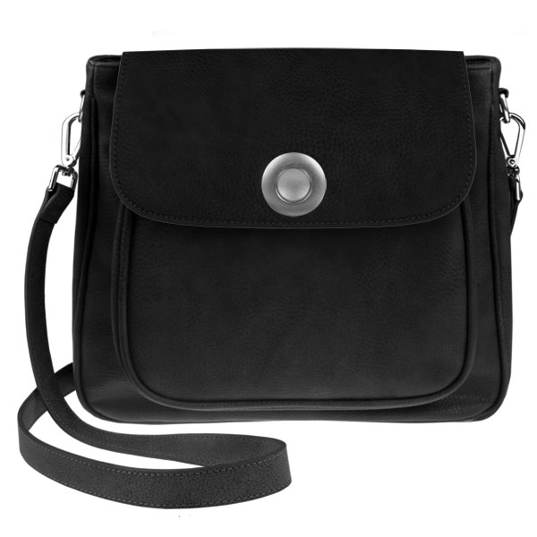 Deze zwarte kunstleren schoudertas combineer je met de vele sierringen.